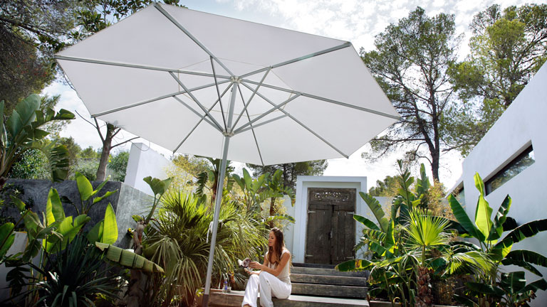 Frei und scheinbar schwerelos schwebt das Sonnendach von Amalfi zwischen Himmel und Erde. Der Mast des Sonnenschirms steht seitlich und schafft viel Freiraum für Tische und Stühle. Wandert die Sonne im Laufe des Tages, so bleibt der Schatten dennoch stets dort, wo er benötigt wird, denn Amalfi ist um 360° drehbar, so dass der Ständer nicht bewegt werden muss. Geöffnet wird der Seitenmastschirm per Kurbelmechanismus. Die Besonderheit: die leichtgängige Seilwinde ist selbsthemmend und hält das Schirmdach in jeder Position sicher fest.